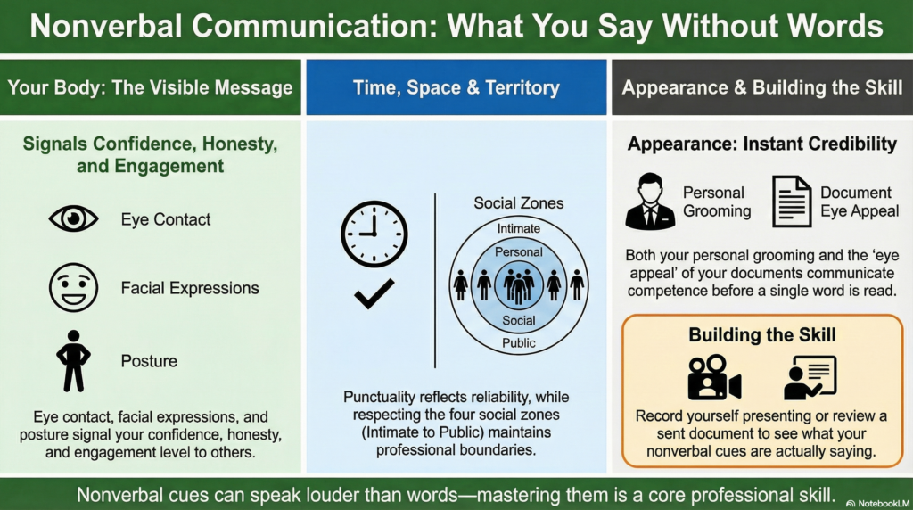 In the textbook, active listening is tied directly to the communication model’s feedback loop. When you listen actively, you generate better feedback — questions that are more targeted, responses that are more relevant, and confirmations that close the decoding gap. In a workplace context, active listening reduces the number of follow-up emails needed to clarify instructions, prevents decisions made on misunderstood information, and signals to the speaker that they are being taken seriously — which builds professional trust faster than almost any other behavior.