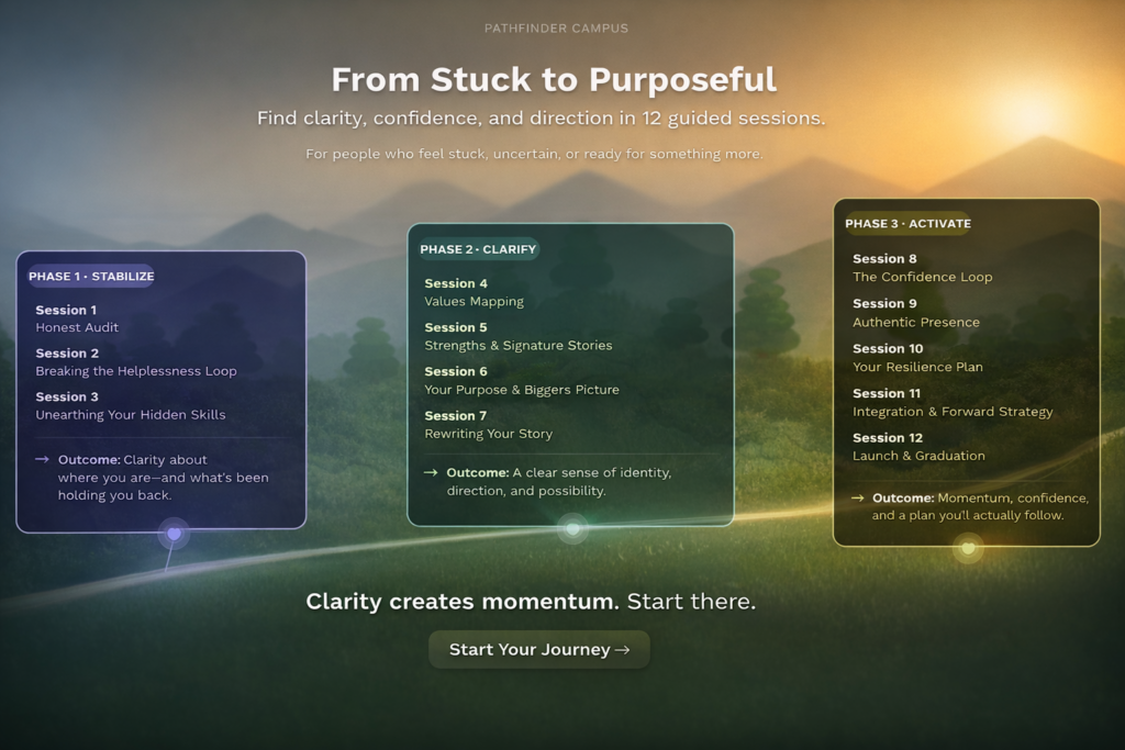 Session 1 — The Honest Audit Session 2 — Understanding Learned Helplessness Session 3 — The Skills Excavation Session 4 — Values Mapping Session 5 — Strengths & Signature Stories Session 6 — Purpose & The Bigger Picture Session 7 — Narrative Reframe Session 8 — The Confidence Loop Session 9 — Authentic Presence Session 10 — Resilience & Relapse Prevention Session 11 — Integration & Forward Planning Session 12 — Launch & Graduation